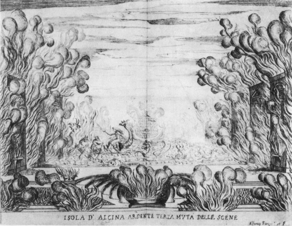 Alcina’s island on fire, a scene from La Liberazione di Ruggiero dall’Isola di Alcina by Francesca Caccini. By set designer Giulio Parigi (via Wikimedia Commons).