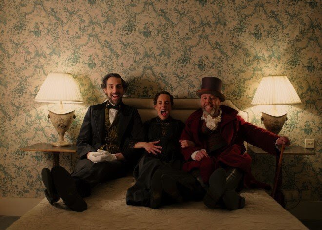 John Savournin as Luka, Clare Presland as Popova and Richard Burkhard as Smirnov in The Bear for Opera Holland Park (Laima Arlauskaite).